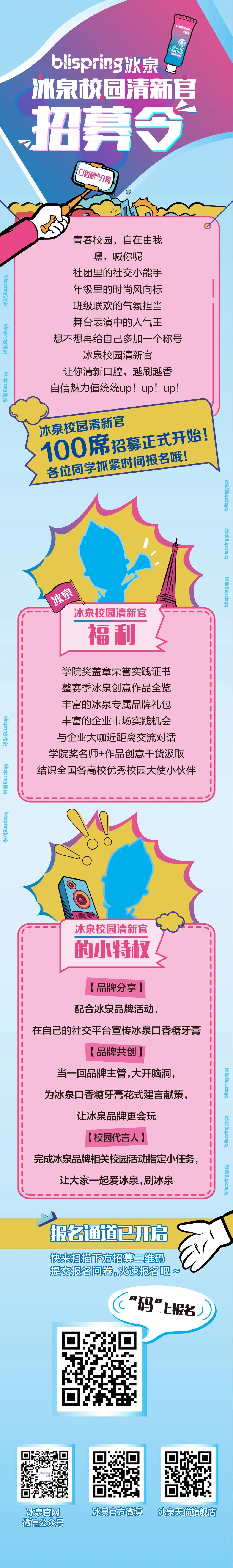 同学们,还在为吃完重口味食物而烦恼吗?还在为社交口气搞砸一切而痛苦吗?还在为浪漫的约会说不出口而悔恨吗?别担心,冰泉口香糖牙膏帮你清新口腔,越刷越香!中国口香牙膏创领者——冰泉,开始招募校园清新官啦,快来报名吧!