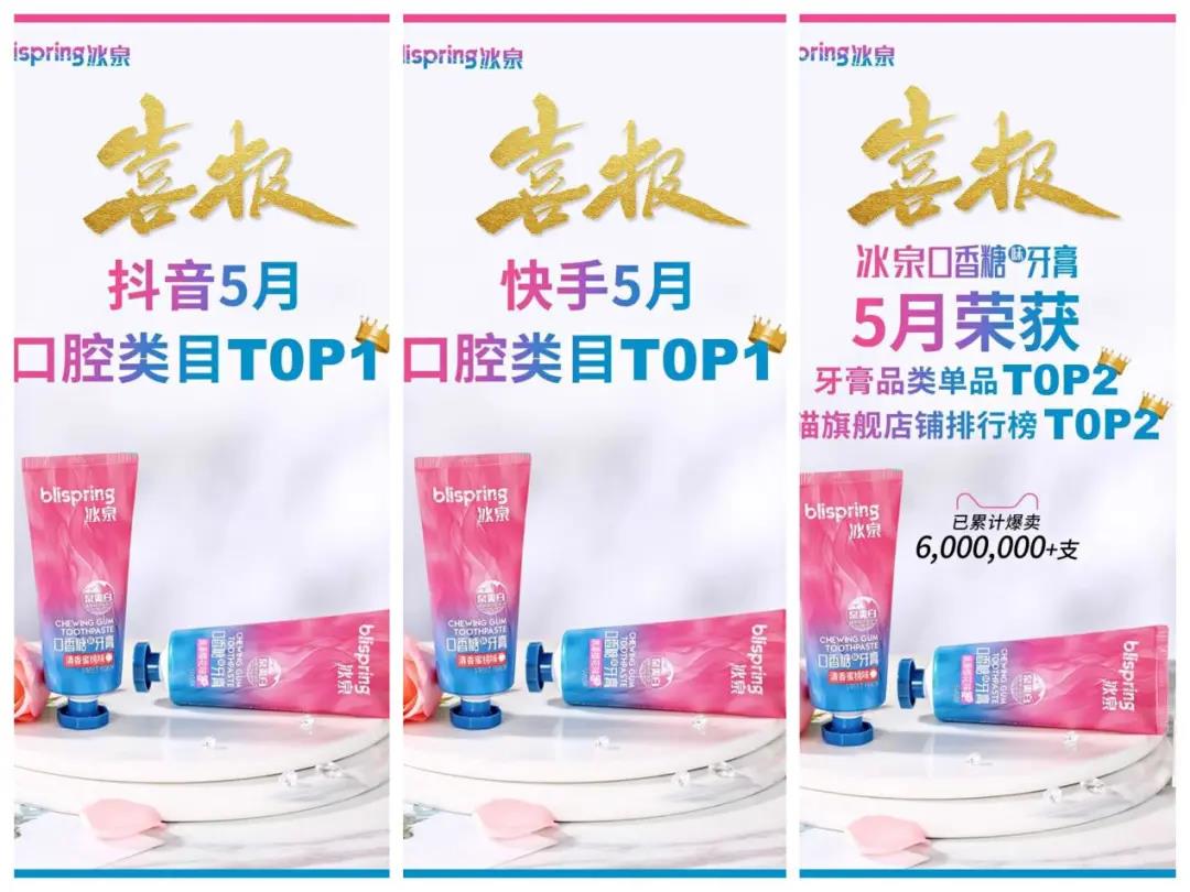 上个月(5月)对于冰泉来说,是市场爆发增长的一个节点。冰泉荣登抖音、快手5月口腔类目销售榜TOP1,这是冰泉连续1年多来占据直播电商平台的榜首。在电商渠道,冰泉口香牙膏已累计售出600万+支,获得牙膏品类单品TOP2和天猫旗舰店铺占排行榜TOP2的好成绩。那么,冰泉是如何在众多品牌中脱颖而出?
