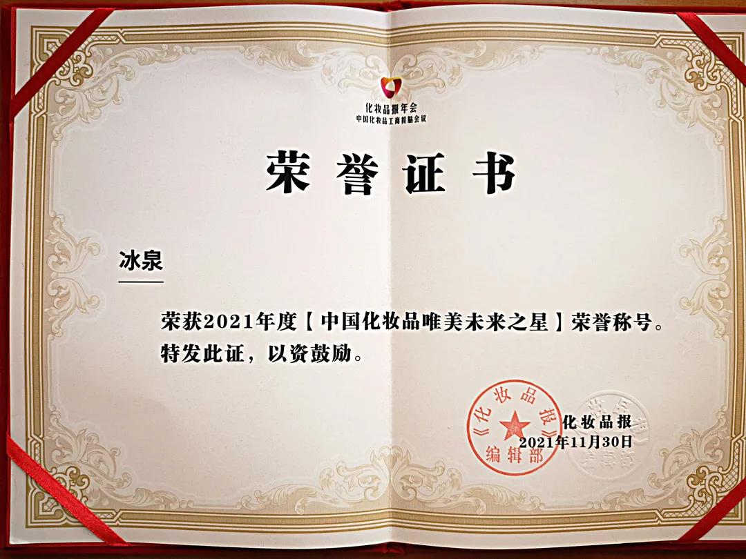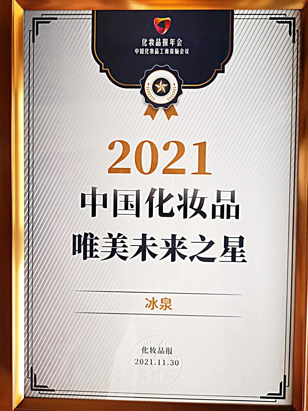 昨日(11月30日),由行业权威媒体《化妆品报》主办的2021化妆品报年会暨中国化妆品工商首脑会议冬至夜宴在武汉火热开启。冰泉精彩亮相,摘得“2021中国化妆品唯美未来之星”奖项,成为耀眼的品牌新星!