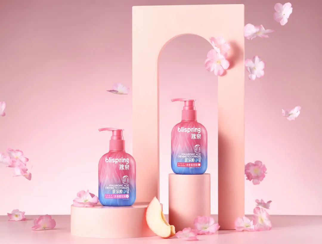 此外,冰泉玻尿酸口香牙膏由国际香氛大师精创调香,专门调制了清香蜜桃味和浪漫樱花味两种口味,膏体中含有的香氛粒子,融合玻尿酸精粹,使口腔散发清新香味,与人社交不再尴尬;青春炫彩的泵压式瓶身设计,轻松压出闪亮膏体,无需沾水刷出绵密泡沫,快速深入牙缝清洁,提升人们刷牙时的愉悦体验,开启了液态膏体新时代,点亮口香时尚美好新生活!