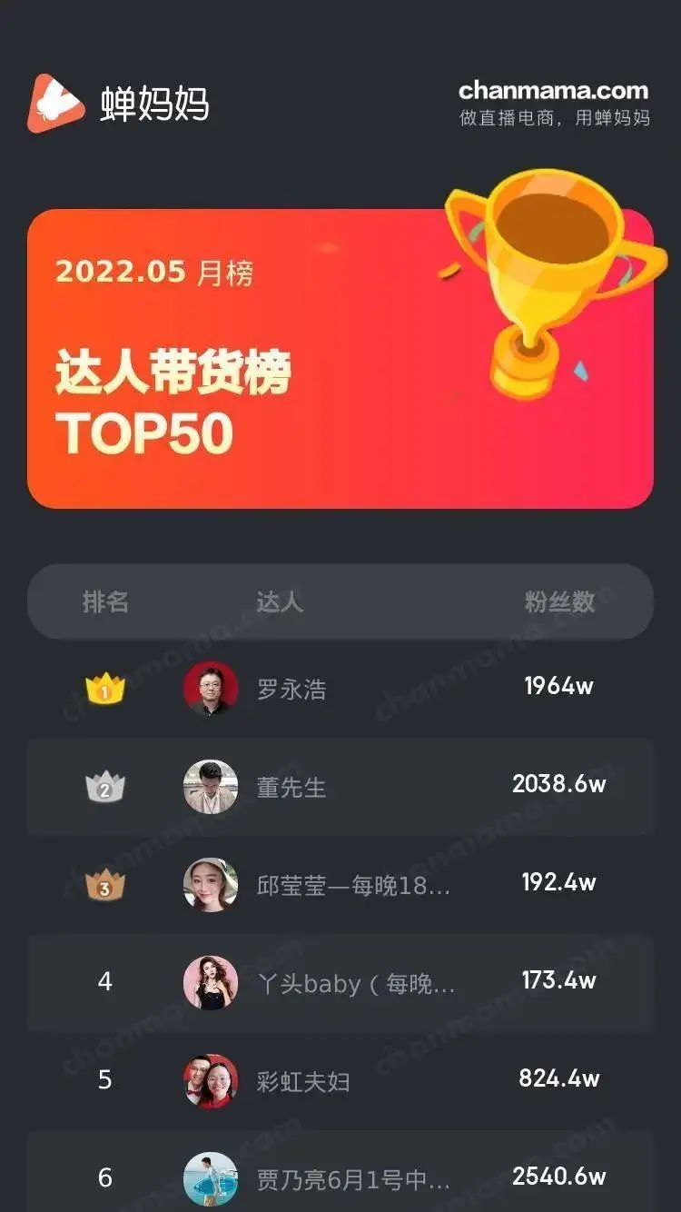蝉妈妈数据显示,5月抖音直播销售额排名TOP50带货达人,销售额都在6200万以上。其中,共有20位主播成功月销破亿,最高突破3亿。销售额排名第一依旧是罗永浩,月带货再度突破3亿。