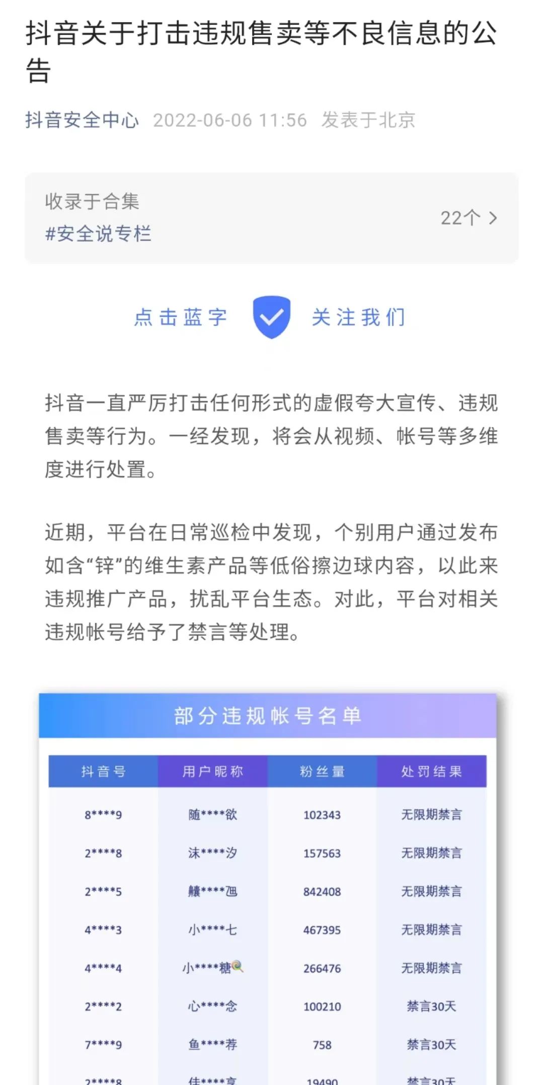 6月6日,抖音安全中心公告称,将持续关注夸大宣传、违规售卖的内容及相关帐号,加大处置力度。近期平台在日常巡检中发现,个别用户通过发布如含“锌”的维生素产品等低俗擦边球内容,以此来违规推广产品,扰乱平台生态。对此,平台对相关违规帐号给予了禁言等处理。