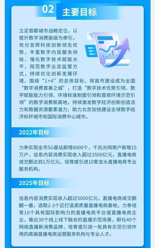 北京市经济和信息化局、北京市商务局近日发布的《北京市数字消费能级提升工作方案》显示,北京市力争2022年实现信息内容消费收入超过3500亿元,直播电商成交额达到1万亿元。