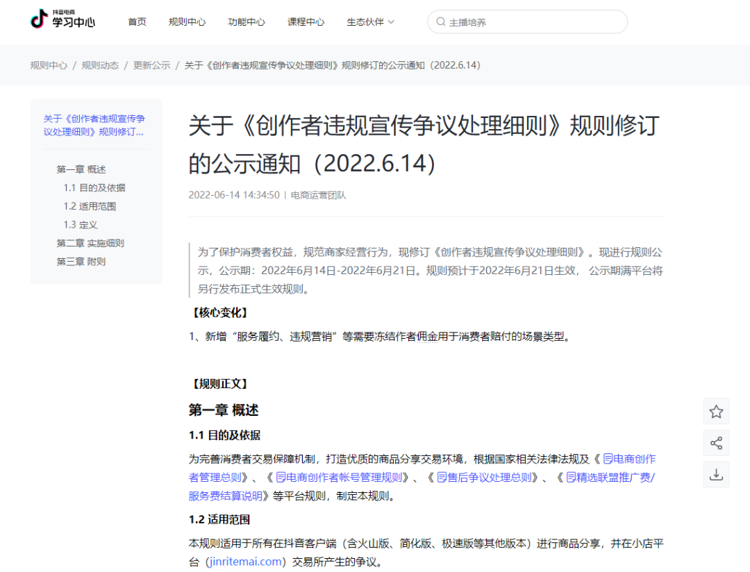 抖音电商修订《创作者违规宣传争议处理细则》,新增“服务履约、违规营销”等需要冻结作者佣金用于消费者赔付的场景类型。