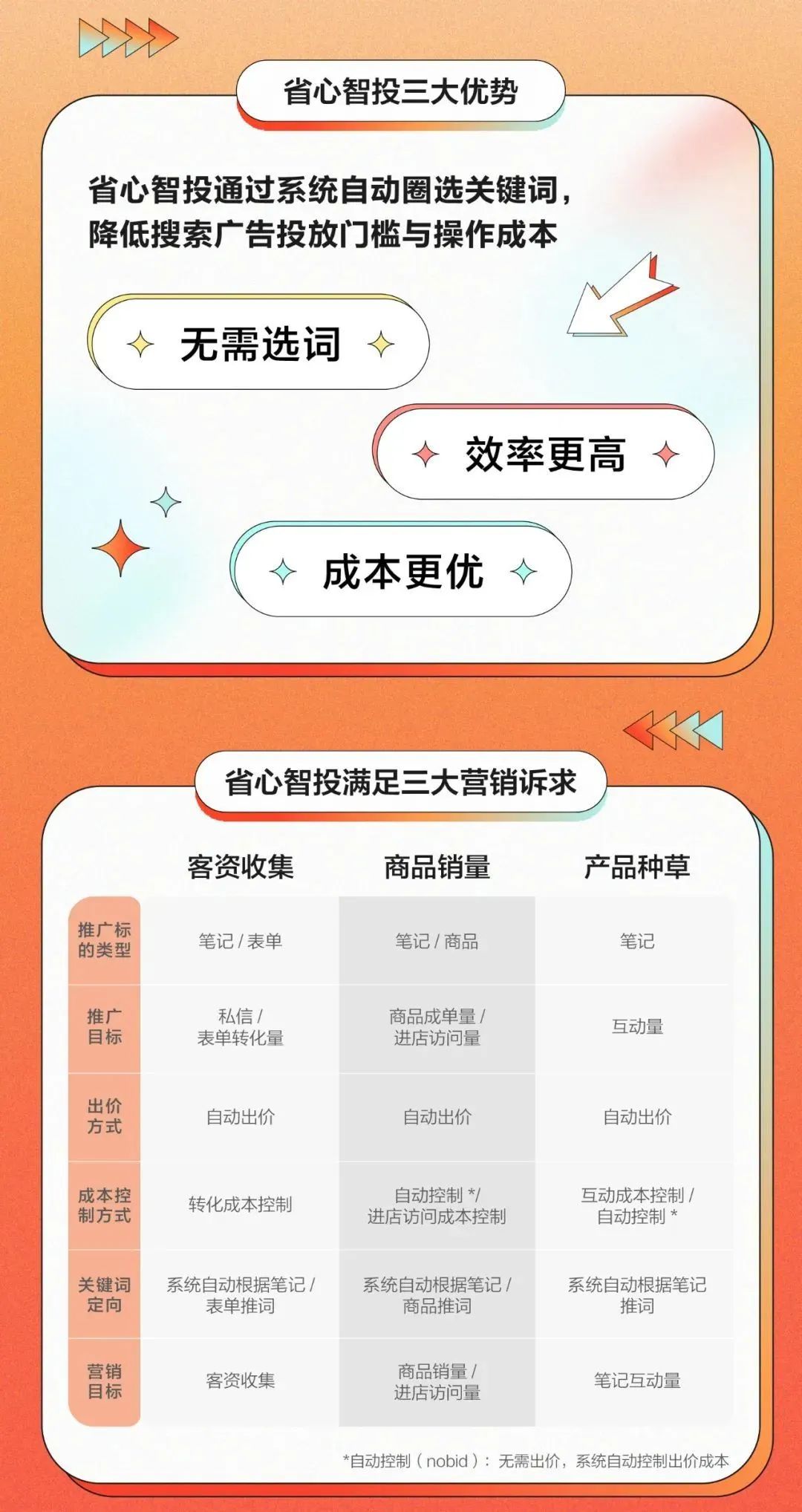 近日,小红书一站式广告投放平台——聚光平台上线了“省心智投”功能。在搜索广告投放模式下开启“省心智投”后,系统会根据广告主的推广目的、目标成本、广告创意等,智能圈选关键词,进行广告自动化投放,降低搜索广告投放操作成本,帮助广告主“省