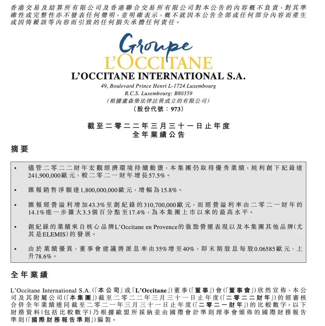 法国美妆护肤公司L’OCCITANE欧舒丹发布截至2022年3月底的2022财年年度业绩公告。财报显示欧舒丹2022财年总体业绩稳健增长:年销售净额为17.81亿欧元,同比增长15.8%,最大市场中国大陆同比增长24.4%;年内溢利达到历史新高2.42亿欧元,较2021财年增长57.5%;经营溢利增加43.3%至历史新高3.11亿欧元。