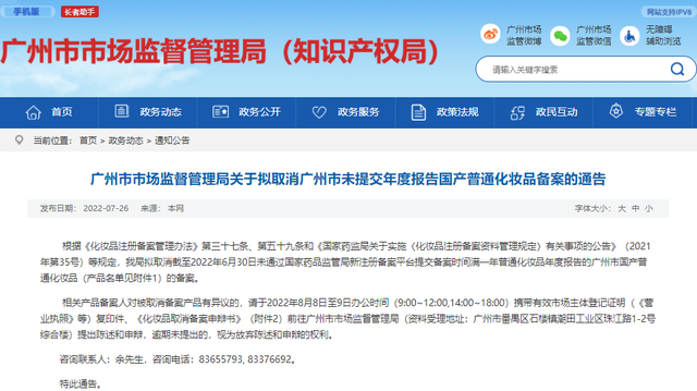 7月26日,广州市市场监督管理局发布关于拟取消广州市未提交年度报告国产普通化妆品备案的通告。有近20万个产品将被取消备案。