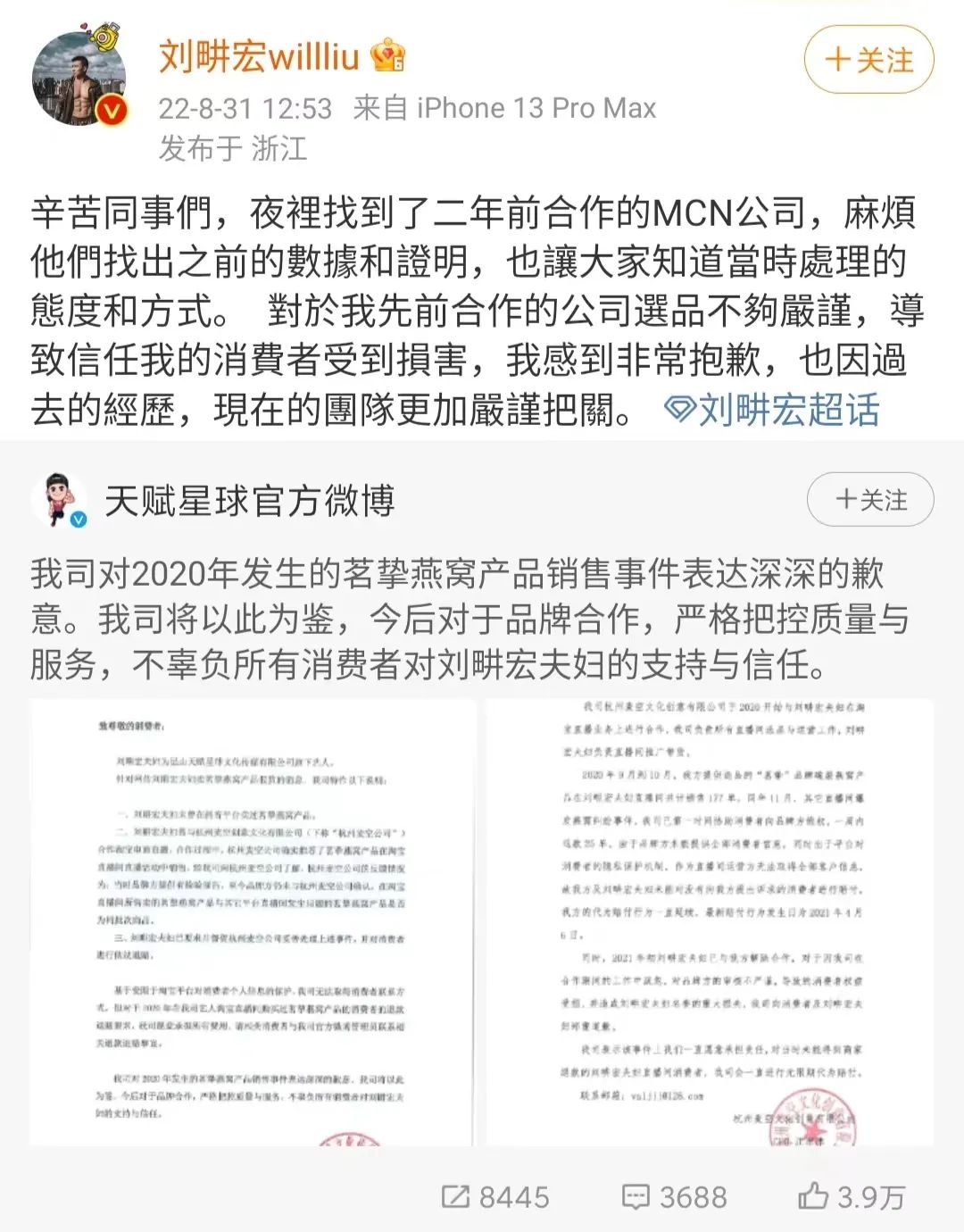 8月30日晚,辛巴发长文爆料刘畊宏夫妇曾卖假燕窝。对此刘畊宏发微博道歉称找到了二年前合作的MCN公司要数据和证明,承认因公司选品不够严谨,导致信任自己的消费者受到损害,未来一定会督促团队更加严谨。