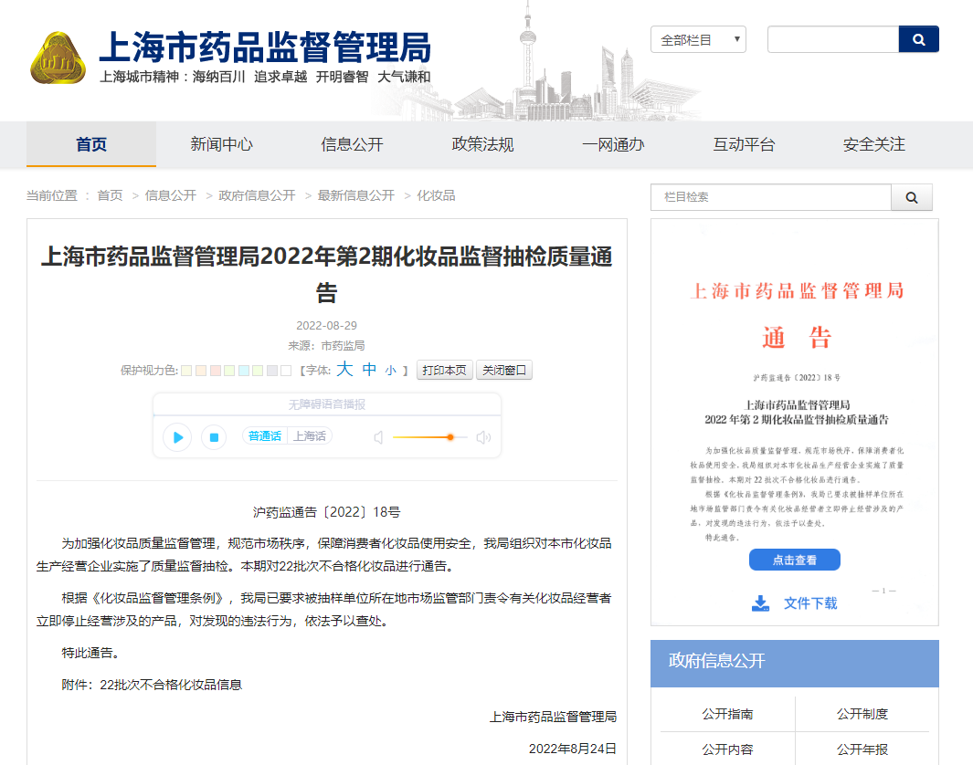 上海药监局公布22批次不合格化妆品名单
