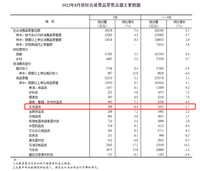 国家统计局发布的最新数据显示,2022年1-8月化妆品类零售总额为2453亿元,同比下滑了2.7%。其中,8月化妆品类零售总额为288亿元,同比下滑6.4%,创近5年新低。