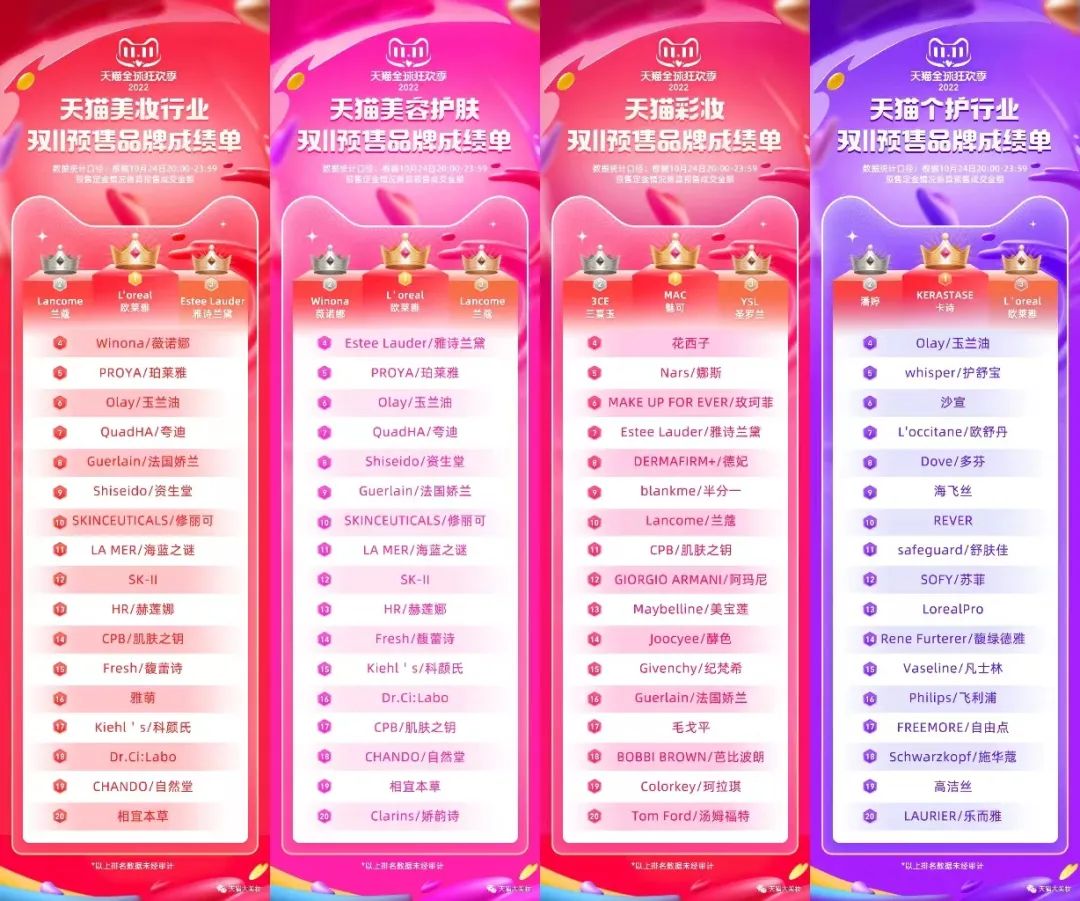 10月25日,天猫公布“双11”预售榜单。其中天猫美妆行业TOP 5分别为欧莱雅、兰蔻、雅诗兰黛、薇诺娜和珀莱雅;天猫美容护肤TOP 5分别为欧莱雅、薇诺娜、兰蔻、雅诗兰黛、珀莱雅;天猫彩妆TOP 5分别为MAC、3CE、YSL、花西子、Nars;天猫个护行业TOP 5分别为卡诗、潘婷、欧莱雅、OLAY、护舒宝。