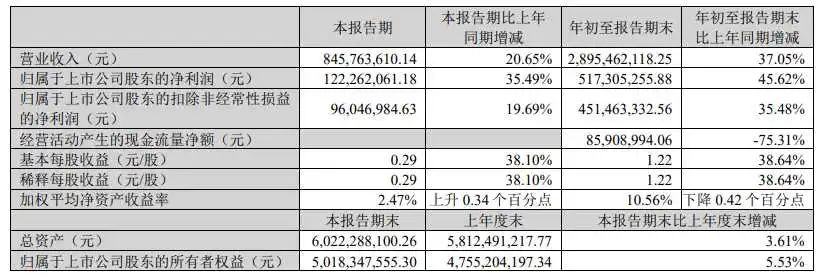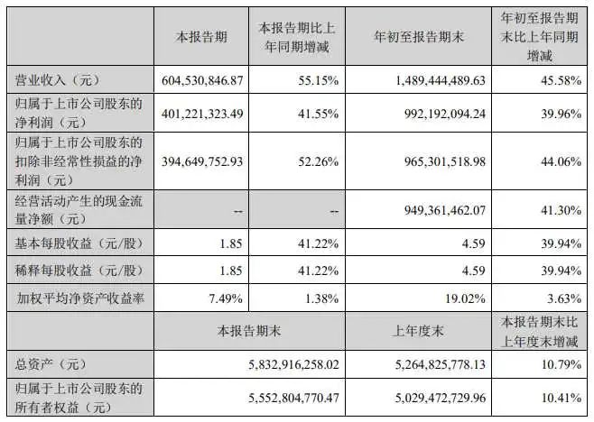 10月25日,爱美客2022年1-9月实现营业收入14.89亿元,同比增长45.58%,归属于上市公司股东的净利润为9.92亿元,同比增长39.96%,每股收益为4.5900元。第三季度爱美客实现营收6.05亿元,同比增长55.15%;归属于上市公司股东的净利润为4.01亿元,同比增长41.55%。
