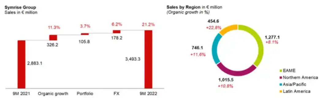 10月26日,香精、香料原料巨头德之馨2022年前三季度销售额为34.93亿欧元(约合人民币253.28亿元),同比增长21.2%,有机增长11.3%;三季度德之馨销售额为12.32亿欧元,同比增长26.4%,有机增长13.6%。活性化妆品成分业务前九个月实现了6.4%的有机销售额增长,销售额为13.16亿欧元(约合人民币95.42亿元)。
