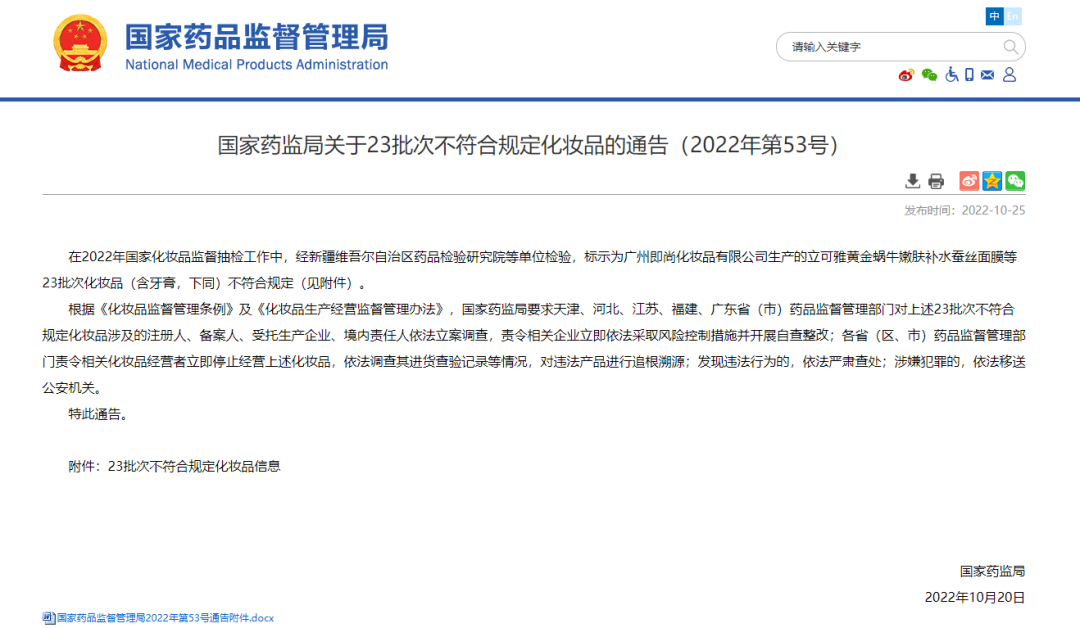 国家药监局网站信息显示,在2022年国家化妆品监督抽检工作中,有23批次化妆品(含牙膏)不符合规定,不合格项目涉及菌落总数超标、成分比对不合格等。