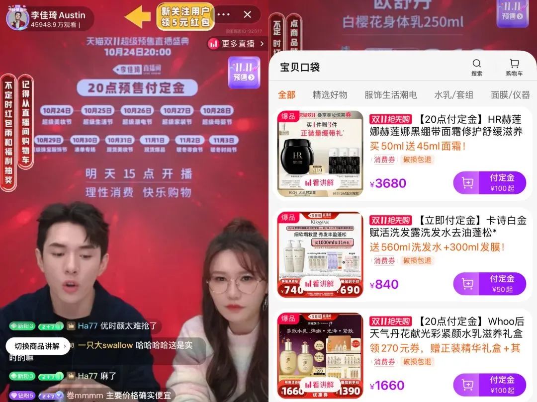 带货主播李佳琦双十一预售首日晚的直播观看量高达4.6亿,首日发售的主要为美妆护肤、个护清洁、服饰、生活以及潮流家电类等产品。